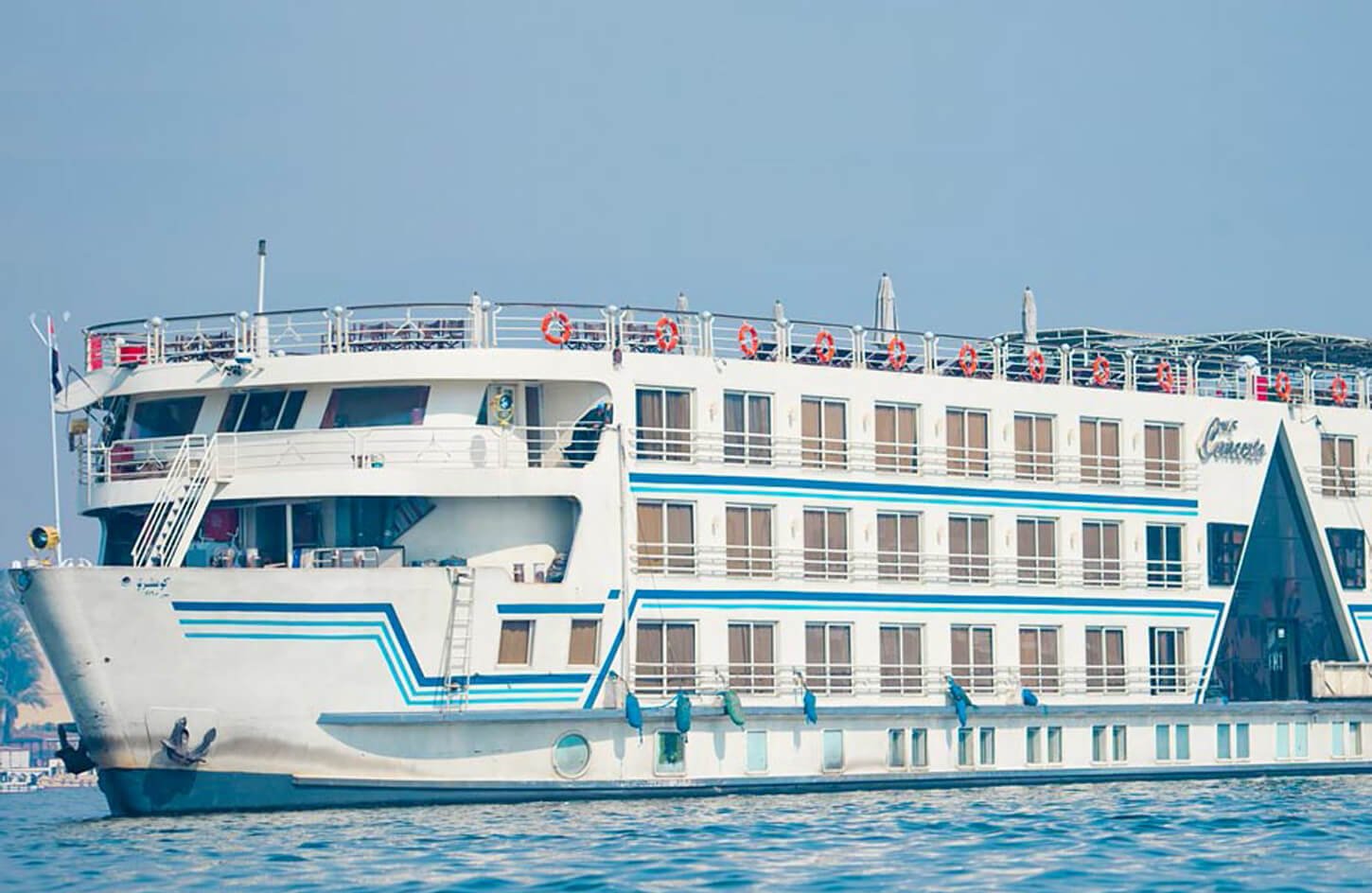 The Concerto Nile Cruise offers a luxurious and unforgettable journey along the Nile River, blending opulence with rich Egyptian heritage. This 5-star cruise provides a perfect mix of comfort, relaxation, and adventure for those looking to explore Egypt’s ancient wonders.The ship features spacious, elegantly designed cabins and suites with large windows that provide stunning views of the Nile. Guests can unwind in the stylish lounge areas or enjoy the sun deck, which features a swimming pool, a bar, and comfortable seating for a relaxing day on the river.